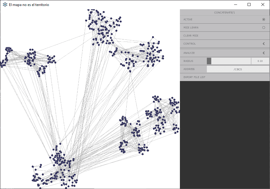 El mapa no es el territorio (MNT) es una aplicación open source desarrollada en openFrameworks, Python y Max. Tiene como objetivo diseñar ágilmente esquemas de mapeo que permitan el control gestual de materiales sonoros. Estos esquemas se presentan como mapas bidimensionales de lectura sencilla, para facilitar la coordinación de estrategias en proyectos multidisciplinarios.